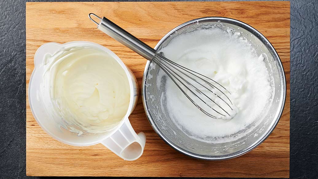 Ta under tiden en annan skål och vispa grädden till nästan styva toppar, vispa sedan äggvitorna till mycket hårda toppar.