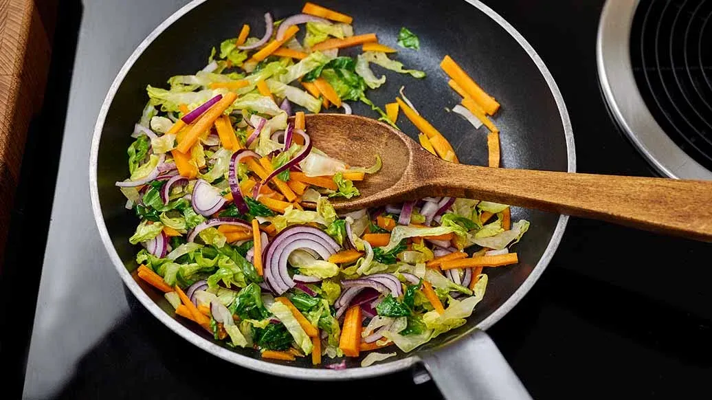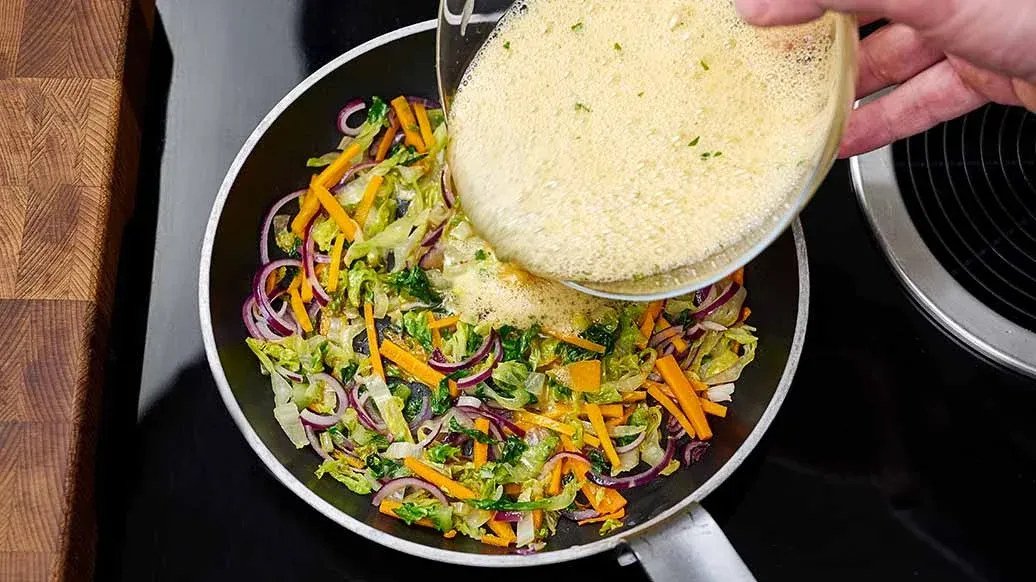Skär spetskålen och moroten i strimlor. Skala löken, skiva i tunna ringar och fräs allt i den uppvärmda Kikkoman Sesamoljan i en liten stekpanna i ca. 5 minuter.