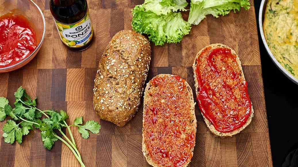 Skär upp baguetterullarna och rosta de skurna sidorna i en separat panna med det uppvärmda smöret. Blanda ketchupen med Kikkoman Ponzu citron och tomatpuré och bred sedan ut på de skurna sidorna av brödet. Tvätta och klappa salladen torr. Toppa de nedre halvorna av bröden med sallad, sedan grönsaks-äggblandningen och koriandern. Lägg de återstående brödhalvorna ovanpå och servera.