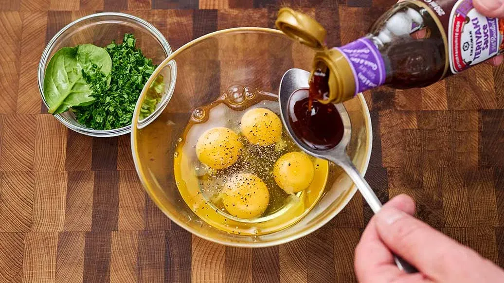 Tvätta spenaten och hacka mycket fint. Vispa äggen med Kikkoman Teriyaki-sås med vitlök, krydda med peppar och rör ner spenaten.