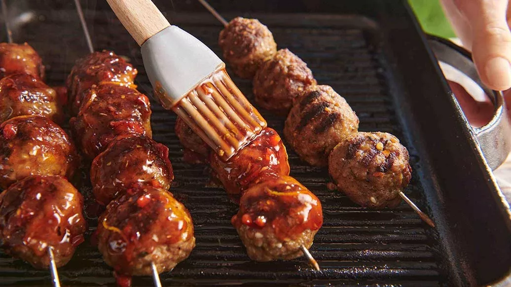 Pensla köttbullarna med olja. Grilla i en het grillform gärna med räfflad botten i ca 5 minuter på varje sida. Pensla sedan köttbullarna med glasyr på varje sida och grilla igen.