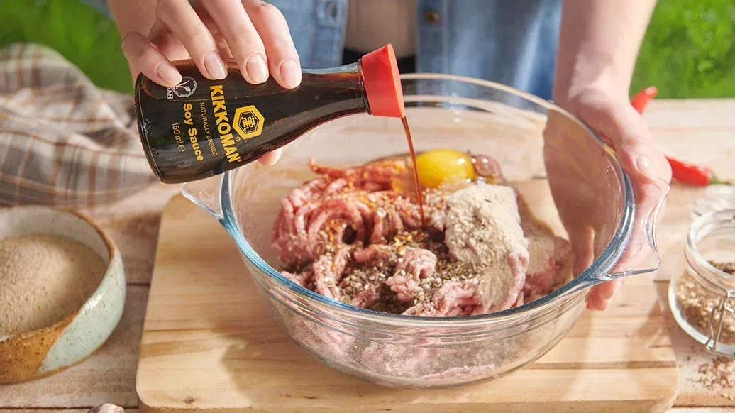 Blanda färsen med ett ägg, Kikkoman sojasås och kryddor. Tillsätt brödsmulorna och blanda igen tills blandningen lätt kan formas.