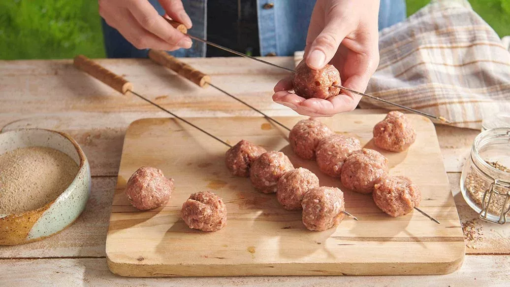 Fukta händerna och forma blandningen till prydliga köttbullar ca 3 cm i diameter. Trä köttbullarna på spett i omgångar om 3 till 5 och ställ i kylen i 1 timme.