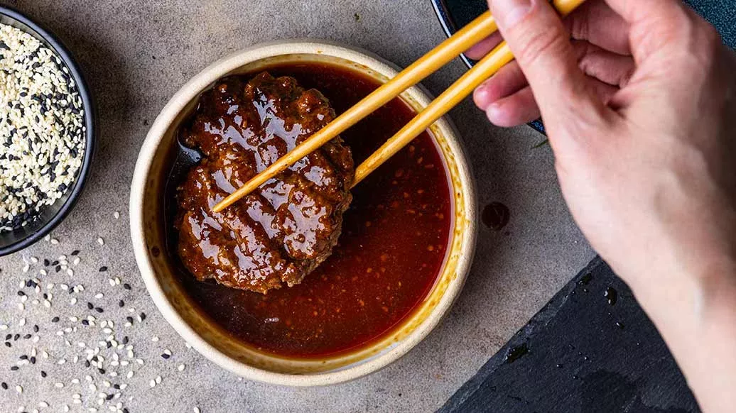 Blanda nötköttet med peppar och Kikkoman sojasås. Forma till 4 biffar och stek ca 3 minuter på varje sida. Doppa de kokta och varma hamburgarna i Kikkoman Teriyaki-sås med vitlök och täck med sesamfrön.