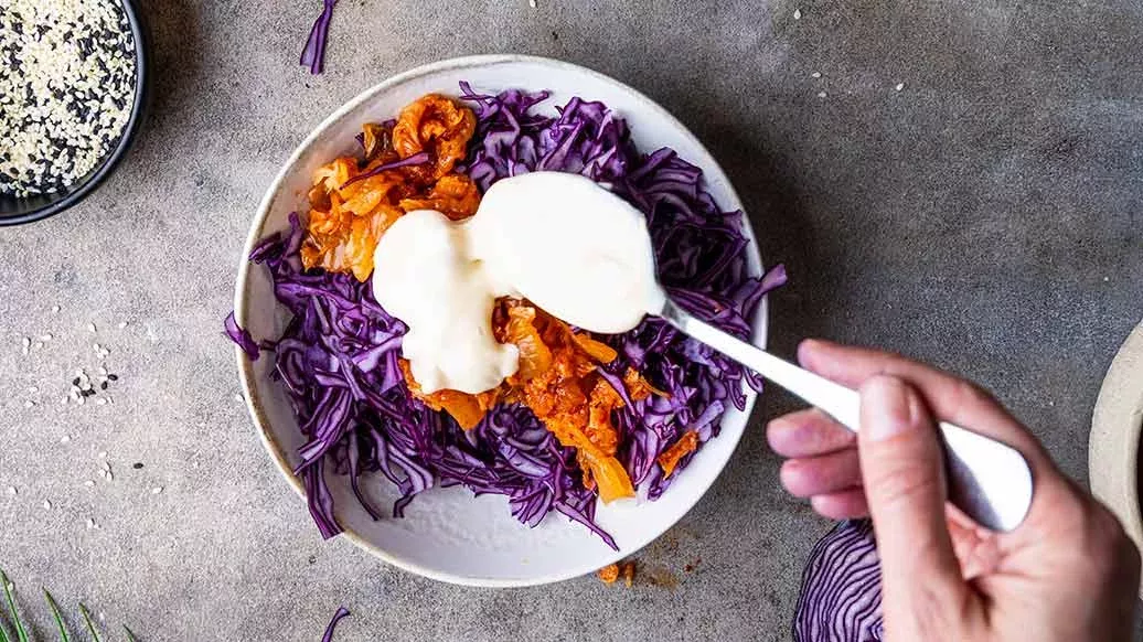 100 g rödkål – 50 g kimchi – 1 tsk risvinäger – 1 tsk honey – 1 msk majonnäs