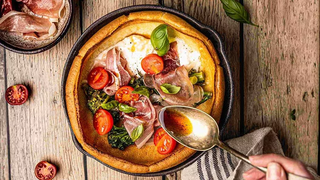 Dessa fluffiga bakade pannkakor är allt annat än platta! Prova den här salta versionen med burrataost, rökt skinka och krispigt friterad Bimi® broccoli, allt med en hint av citron från Kikkoman Ponzu. Det perfekta valet för en utsökt och nyttig frukost.