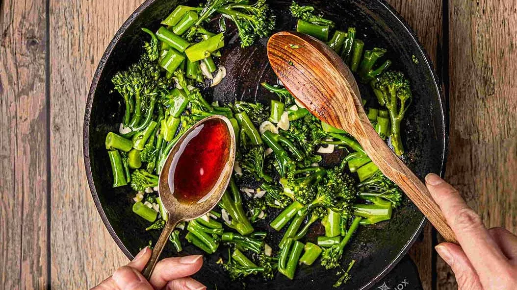 150 g Bimi® broccoli – 2 msk olivolja – 1 vitlöksklyfta – 1 msk Kikkoman Ponzu - en Blandning av Sojasås, ättika och citron