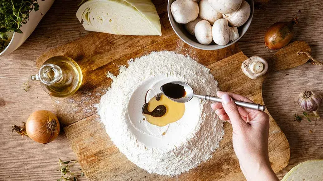 Häll mjölet på en arbetsyta och gör en grop i mitten. Tillsätt oljan, Kikkoman sojasås och varmt vatten. Blanda och knåda tills degen är slät och elastisk. Täck degen med en skål och låt vila i cirka 20 minuter.