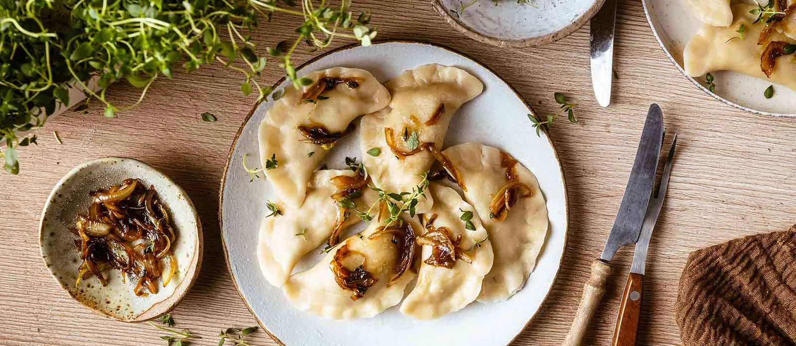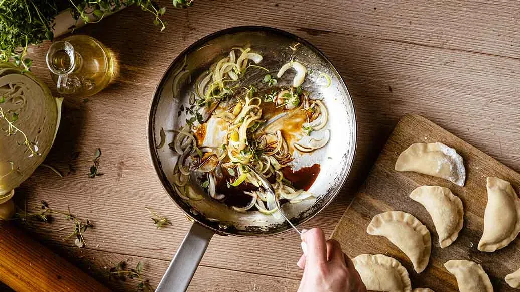 Skär löken i tunna klyftor och fräs i oljan. Tillsätt honung, Kikkoman sojasås och hälften av timjanbladen. Servera dumplingsen toppad med den karamelliserade löken och med de återstående timjanbladen strödda över.