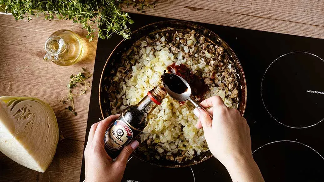 Handgjorda dumplings fyllda med vitkål, svamp och lök. Kikkoman sojasås och Kikkoman kimchi chilisås ger umamidjup och mild hetta, vilket förvandlar denna enkla rätt till en tröstande och värmande hemlagad matlagning.