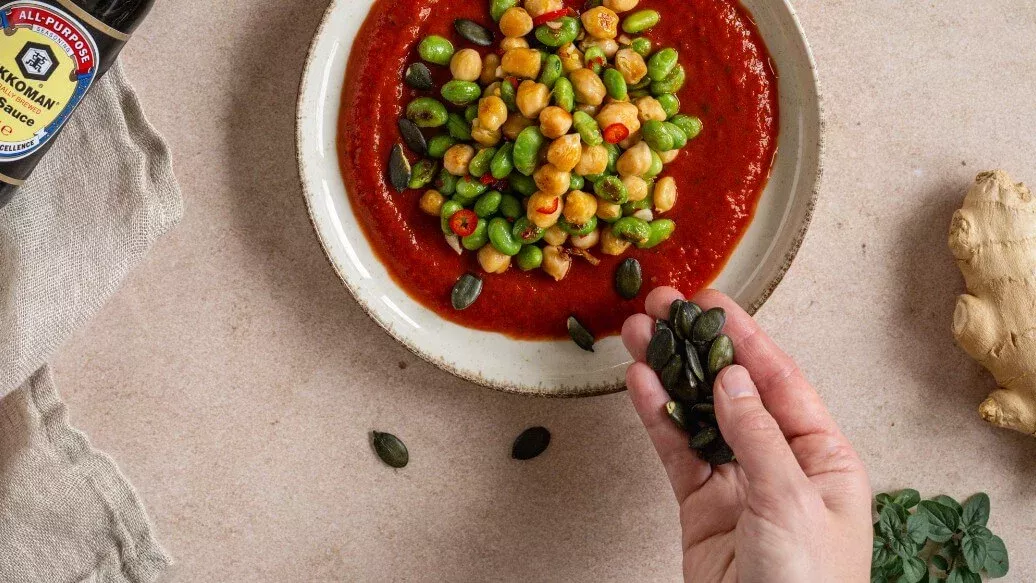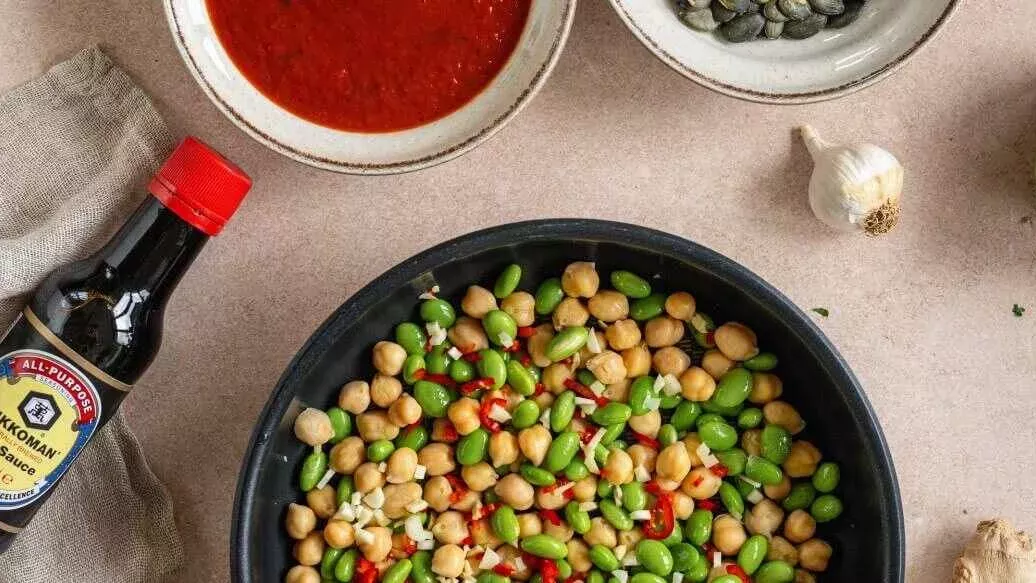 Värm olivoljan i en separat panna och fräs kikärtorna och edamamen med finhackad vitlök, ingefära och chili. När de blir gyllenbruna serverar du dem med såsen.
