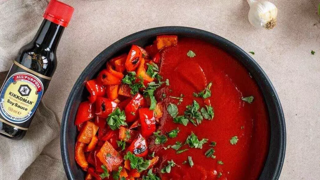 Fräs de tärnade paprikorna i olivolja. När skalet blivit mörkt, tillsätt örter och tomatpassata. Sjud i 10 minuter, smaka av med Kikkoman sojasås och peppar och blanda till en slät sås.