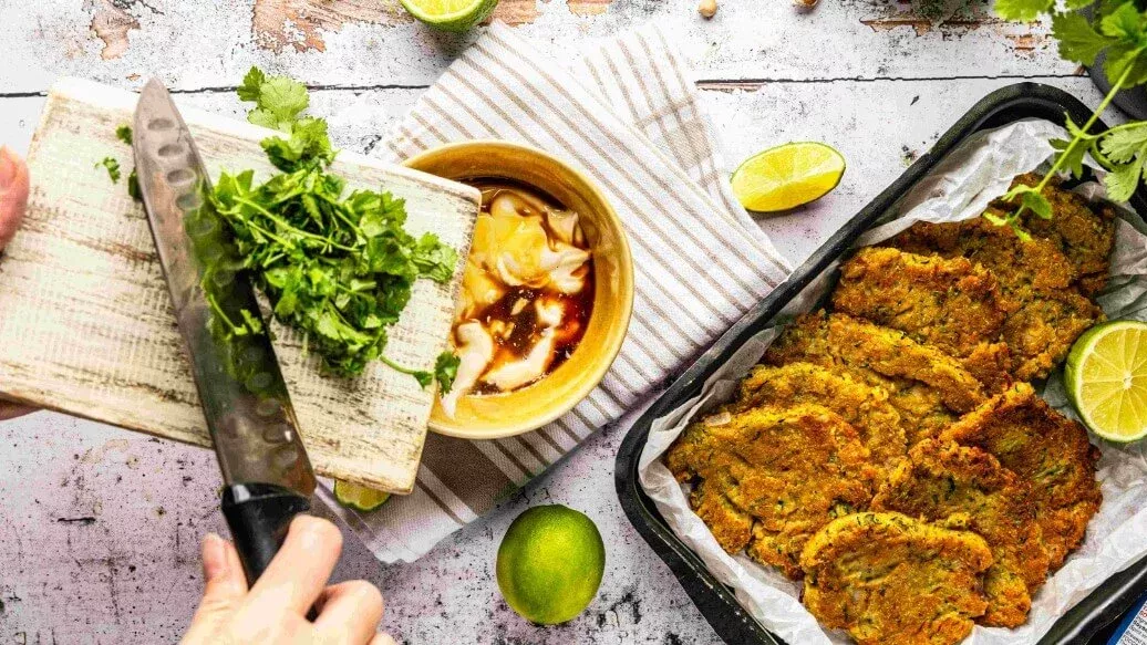 Smakrika, lätt kryddiga och mättande kikärts- och zucchinipannkakor med en uppfriskande koriander- och limebaserad sås. En näringsrik och mycket smakrik rätt.