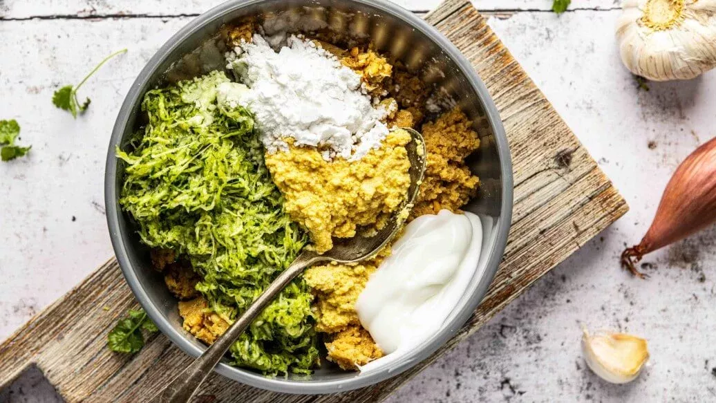 Skala och tärna schalottenlöken. Krossa vitlöken i en vitlökspress. Fräs i en matsked olja och lägg i en skål. Tillsätt de mosade kikärterna, avrunnen zucchini, kikärtsmjöl blandat med vatten, yoghurt och potatismjöl. Blanda till en jämn konsistens.