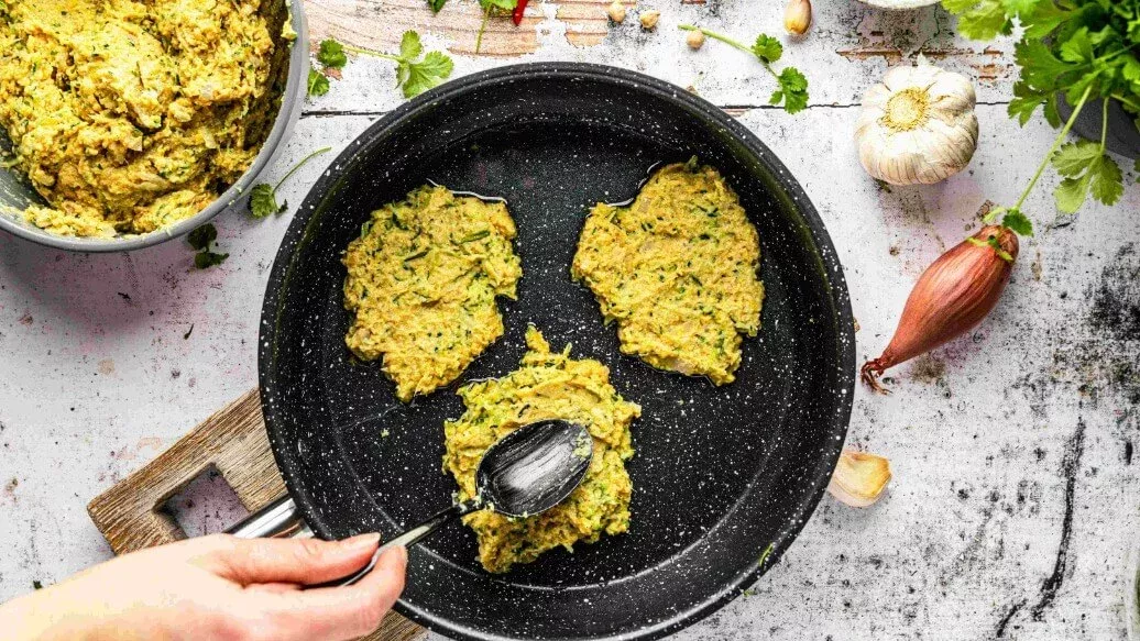 Servera med de förberedda zucchini- och kikärtspannkakorna.