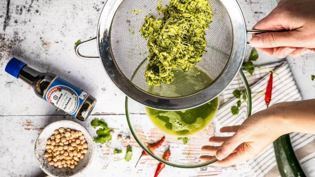 Riv zucchinin med ett fint rivjärn, lägg i en sil och strö över en nypa salt. Blanda och låt stå i 15 minuter. Pressa sedan ur överflödig juice.