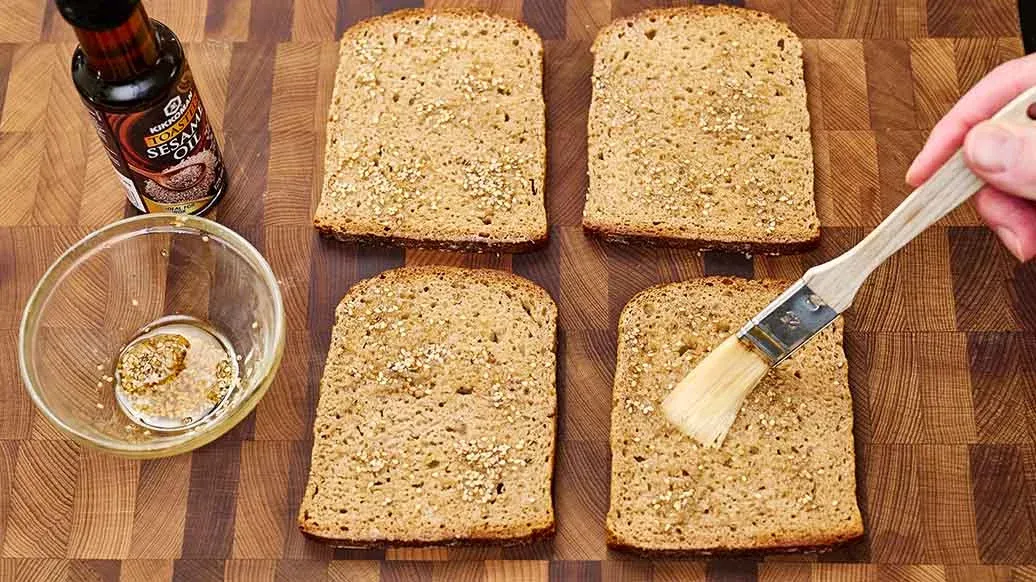 Skala och finhacka vitlöken, blanda sedan med 1 msk Kikkoman Sesamolja och sesamfröna. Täck brödskivornas ena sida med blandningen och rosta i en stor (grill)panna med den oljade sidan nedåt, ta sedan bort från pannan.