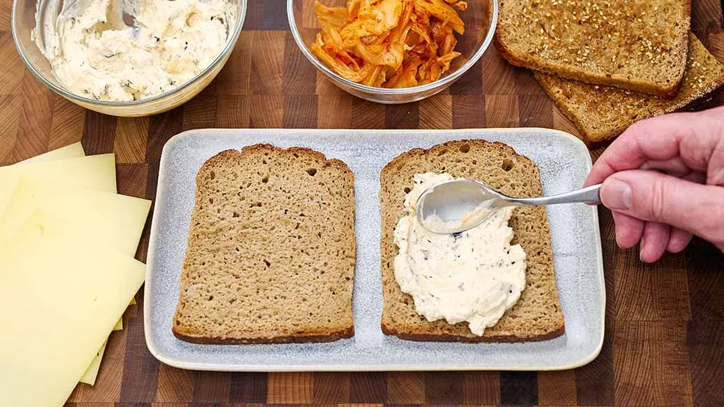 Fördela färskostblandningen över den orostade sidan av brödskivorna, varva sedan med ost, kimchi, svamp och ytterligare en skiva ost. Toppa med resterande brödskivor.