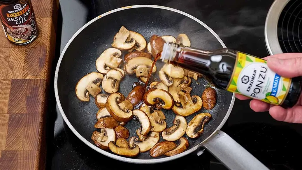 Skär svampen i skivor ca. 2 mm tjocka och stek i 1 msk uppvärmd Kikkoman Sesamolja i ca. 3 minuter. Tillsätt Kikkoman Ponzu citron och fortsätt att steka tills den har avdunstat och svampen är glaserad. Krydda med peppar.