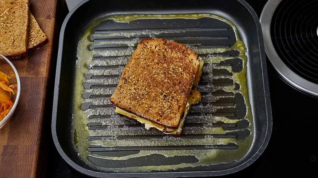 För alla som gillar ost! Krispigt sesam-vitlöksbröd möter kryddig kimchi och smält ost i denna grillrostade smörgås som säkerligen kommer att vinna över alla smörgåsälskare.