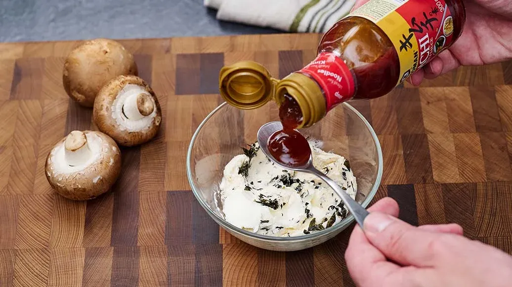 Finhacka nori-arket och blanda med färskost och Kikkoman Kimchi chilisås.