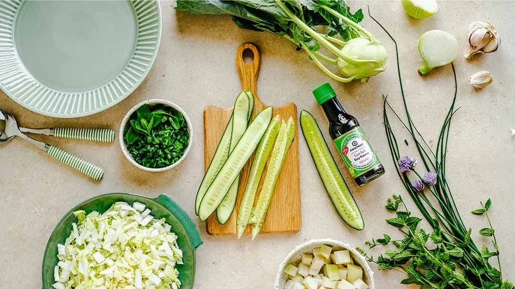 1 huvud Kinakål – 1 lång gurka – 1 kålrabbi – 1 knippe gräslök – 1 kvist färsk mynta