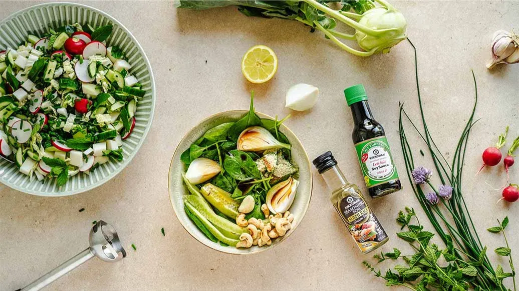 Blanda spenat, lök, vitlök och de sparade gurkfröna till en slät sås med olivolja, Kikkoman sojasås med mindre salt, Kikkoman kryddblandning för sushiris, citronjuice, näringsjäst och cashewnötter. Häll dressingen över grönsakerna och blanda noggrant.