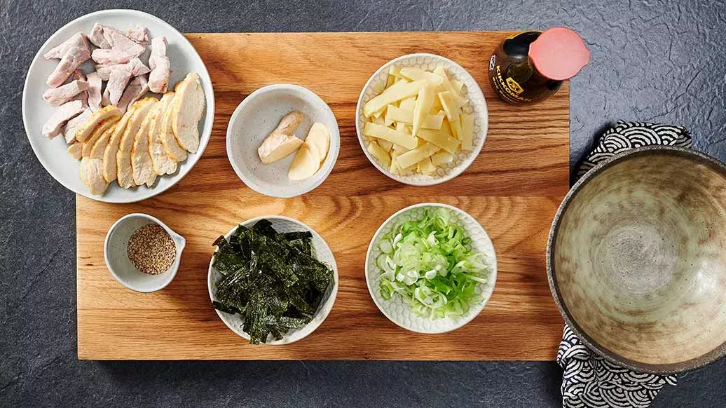 Häll av vätskan från bambusskotten. Tunnskiva salladslökarna och sjögräset. Skala och skär ingefäran i 4 tunna skivor (1 per tallrik). Lättrosta sesamfröna guldgula i en stekpanna under omrörning. Skiva fläsksteken och kycklingbröstet.