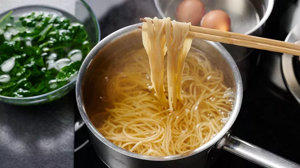 Koka nudlarna al dente och spola hastigt av dem i kallt vatten. Förväll spenaten i 1 sekund och spola hastigt i isvatten. Stick ett litet hål i äggen med pickaren, lägg i kokande vatten och koka dem mjuka som vax i 6 minuter. Häll av vattnet och spola av äggen i kallt vatten.