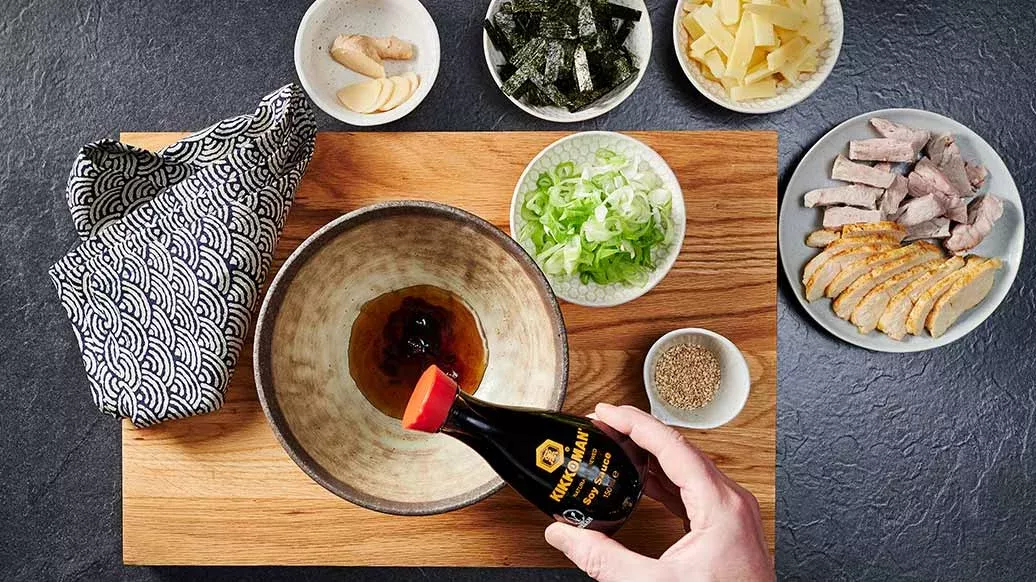 Häll vardera 1 tesked Kikkoman Naturligt bryggd sojasås och 1 tesked fisksås i förvärmda soppskålar. Fördela de förberedda ingredienserna i skålarna och häll över den kokande heta buljongen. Till sist, skala och halvera äggen och lägg vardera 1 ägghalva ovanpå. Peppra eventuellt efter tycke.