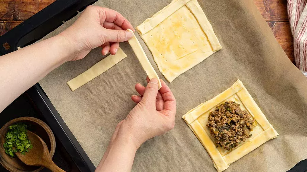 Pensla alla ytor med ägget. Lägg de 4 remsorna på alla kanter. Lägg fyllningen som förberetts i steg 1 i mitten och pensla kanterna igen med ägget.