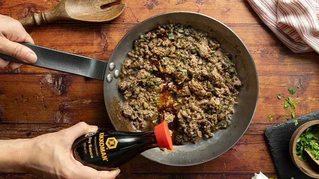 Skiva löken och finhacka svampen. Tillsätt Kikkoman sesamolja i en panna och fräs svampen och salladslöken när pannan är varm. När de är mjuka, tillsätt nötfärsen.