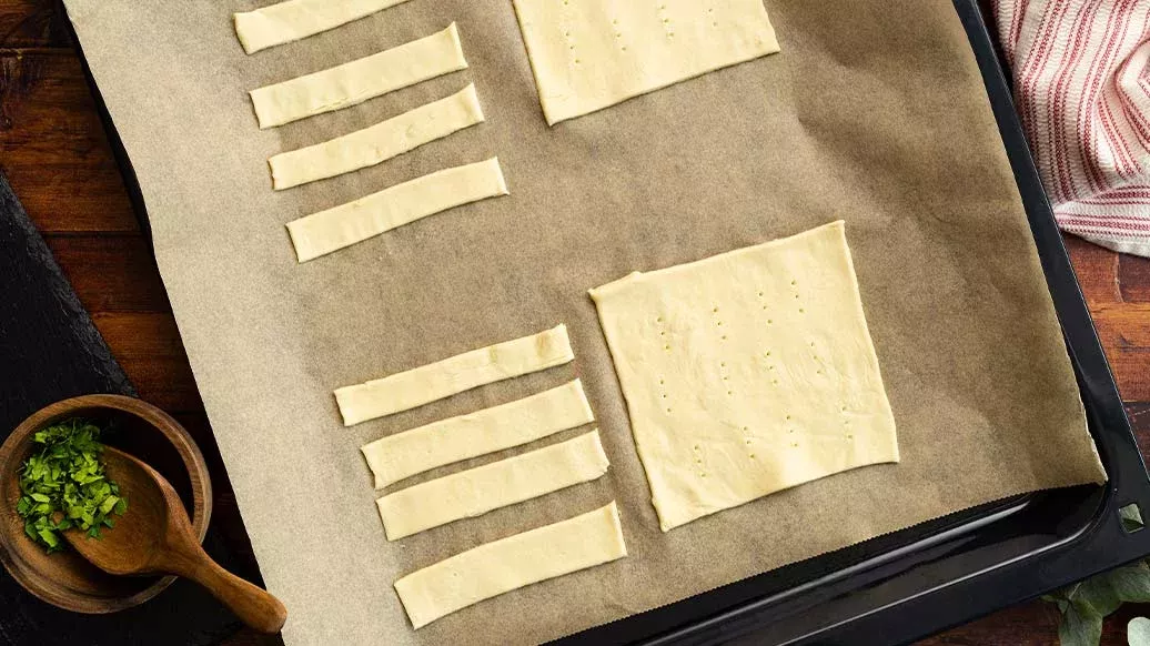 Rulla ut smördegsarken och skär dem i 8 rutor (8 x 8 cm), skär sedan 4 av dem i 4 långa remsor (2 x 8 cm vardera).