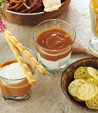 Strax före serveringen: Lägg först gräddfilen (eller crème fraiche) i en liten skål eller ett glas och sötpotatisdippen ovanpå och servera.