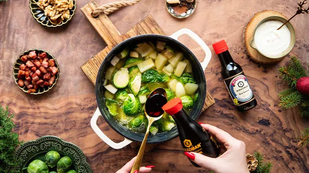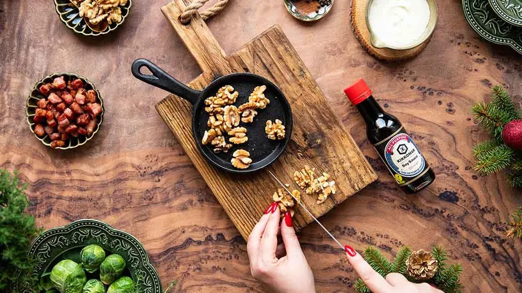 En len, värmande blandning av brysselkål och potatis med rökt bacon och en skvätt Kikkoman sojasås för extra djup. Toppad med krispiga valnötter och en snurr av crème fraîche för en festlig och elegant förrätt.