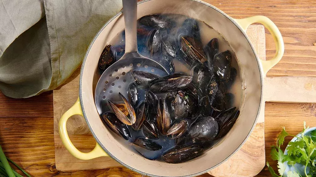 Lägg musslorna i en kastrull, täck med vatten och sätt på medelhög värme. Koka tills skalen har öppnat sig (ca 5-7 min). Häll av dem och låt dem svalna i 3-4 minuter. Ta sedan loss musslorna från skalet och ställ åt sidan.