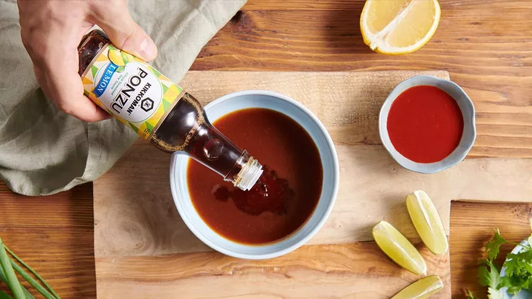 Blanda alla ingredienser: Kikkoman Ponzu, sriracha, ketchup, skal från lime och citron – för att skapa en välblandad sås.