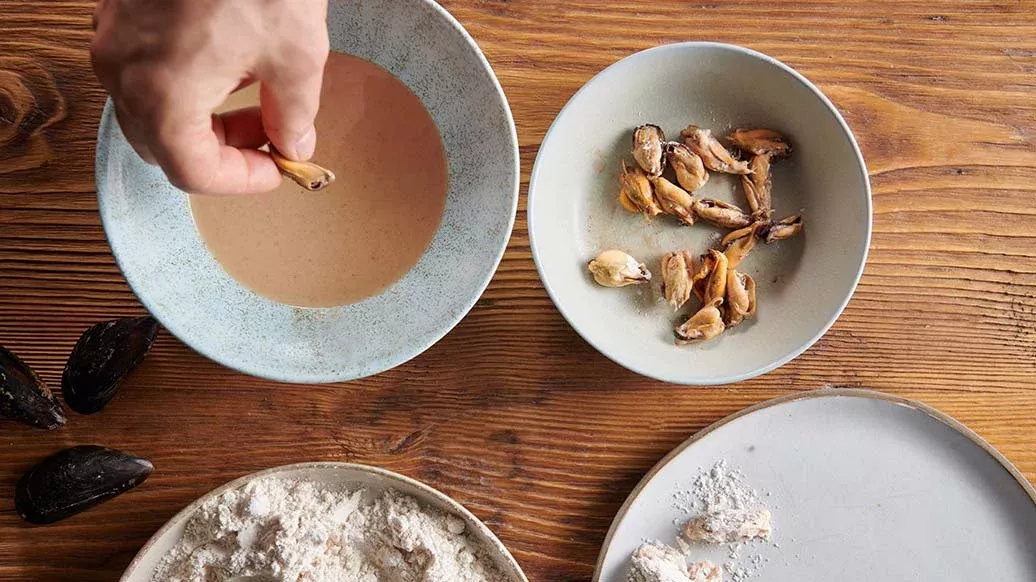 Lägg nu musslorna i smeten, blanda väl och överför sedan till resten av den torra blandningen. Se till att alla musslor är täckta med en fin skorpa. Stek musslorna i förvärmd olja i cirka 2-3 minuter eller tills de är fina och gyllenbruna.