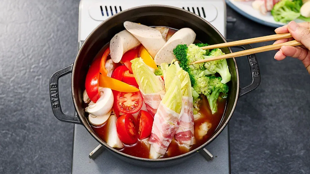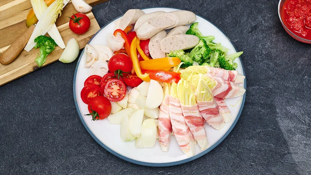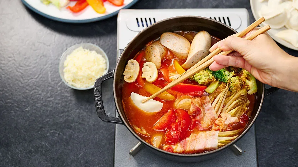 En enkel varm gryta med välkända europeiska ingredienser, med en syrlig tomatsmak och hettan från Kikkoman Kimchi Chilisås. Rökig bacon, korv och smält ost ger en fyllig umami. Snabb att tillaga vid bordet och perfekt att dela.