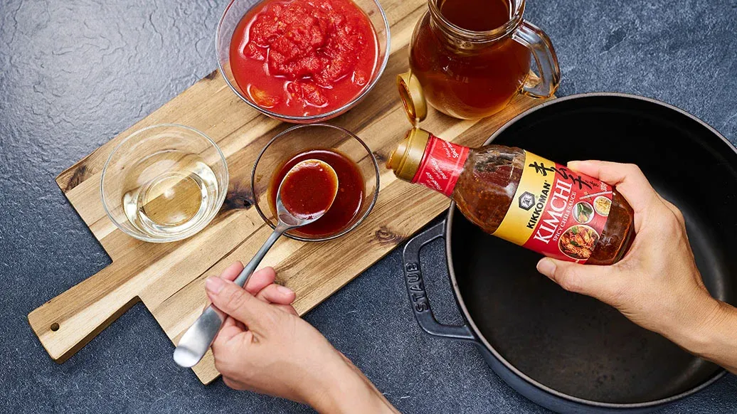 500 ml kycklingbuljong – 400 g krossade tomater på burk – 50 ml vitt vin – 4 msk Kikkoman Kryddig Chilisås för Kimchi