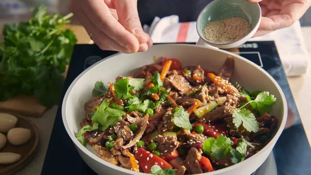 Kryddstarkt nötkött med en blandning av paprika, morot, pak choi och ärtor marinerad i Kikkoman sojasås med en touch av sambal oelek eller Kikkoman Kimchi chilisås, serverad med koriander och sesamfrön.