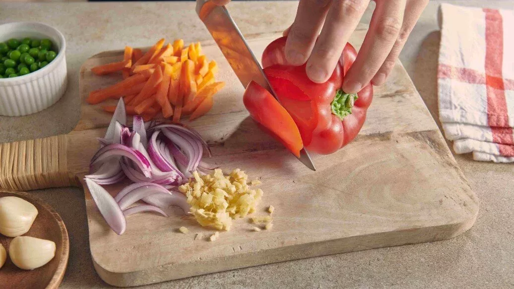 Finhacka vitlök och ingefära. Skiva paprikan och moroten i strimlor. Skär rödlöken och pak choi i större bitar.