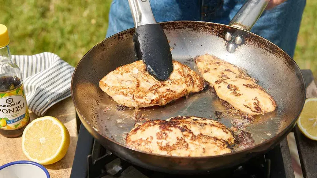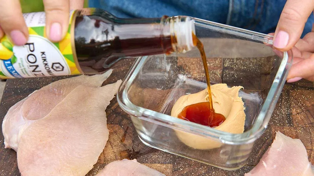 Skär kycklingen i medelstora skivor (ca 1,5 cm tjocka) och krydda med peppar. Blanda jordnötssmöret med Kikkoman Ponzu citron för att skapa en marinad, täck sedan kycklingen noga och låt den marinera.