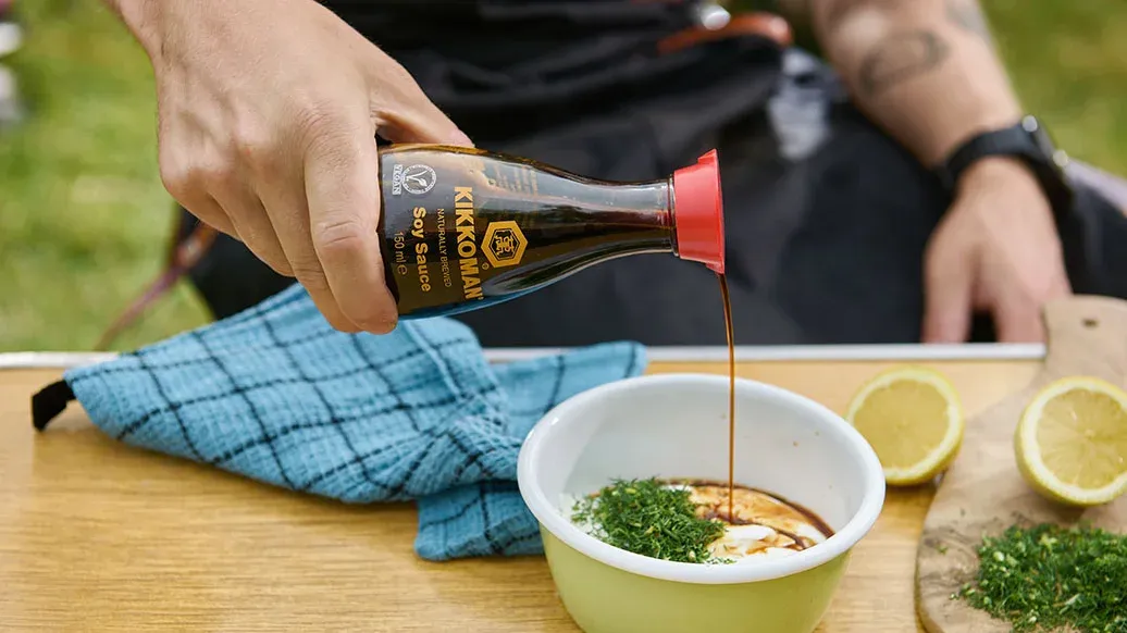 120 g grekisk yoghurt – 1 msk hackad färsk dill – 1 tsk citronjuice – 2 tsk Kikkoman naturligt bryggd sojasås – 10 g färsk dill, till garnering