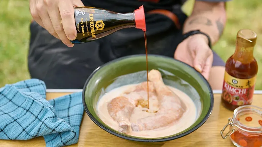 Blanda kärnmjölken, hackad vitlök, paprikapulver, Kikkoman Kimchi chilisås och Kikkoman sojasås i en skål. Lägg till kycklinglåren och se till att de är helt övertäckta. Täck över och låt marinera i minst 2 timmar eller över natten för bästa resultat. Värm grillen till medelvärme. Ta bort kycklingen från marinaden och låt överskottet droppa av. Pensla kycklingen med olivoljan. Lägg kycklingbenen på grillen och stek i 30-40 minuter, vänd då och då, tills innertemperaturen når 75 °C och skinnet är knaprigt och förkolnat.