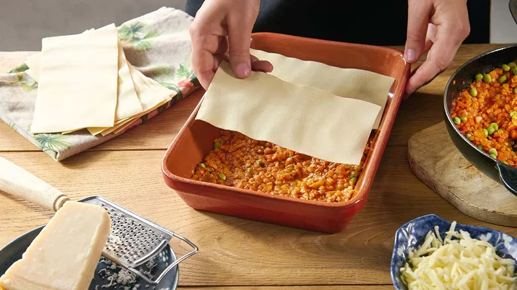 Upptäck en fräsch variant på lasagne där linser och grönsaker blandas i en sojasås fylld av umami, allt krönt med smakrik parmesan och sesamskorpa som får dig att längta efter mer.