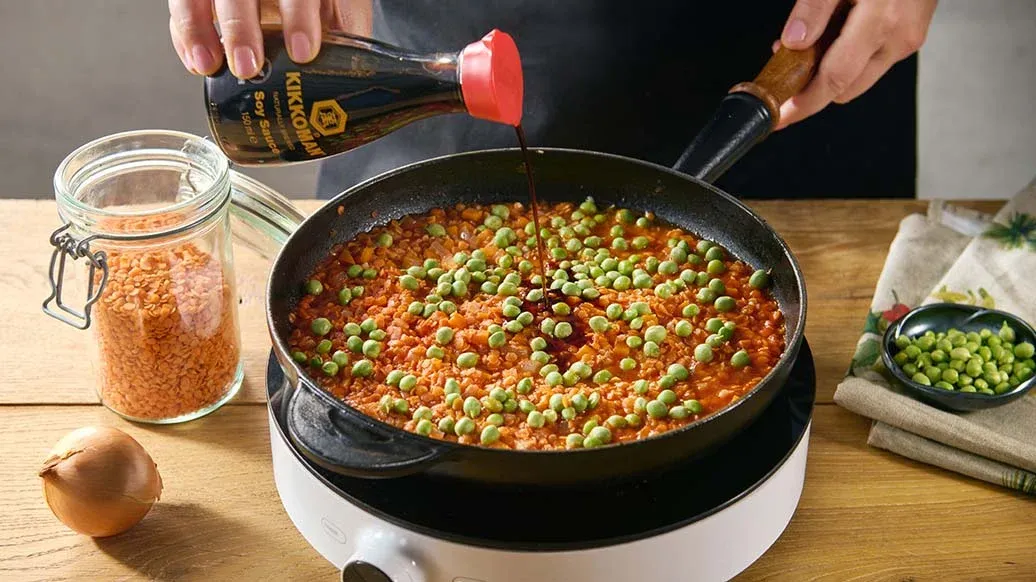 Finhacka löken och vitlöken, tärna moroten och fräs grönsakerna i olja i 5 minuter. Tillsätt sedan tomatpurén, vattnet, Kikkoman sojasås, gröna ärtor och linser. Koka i ca 10 minuter tills linserna är mjuka.