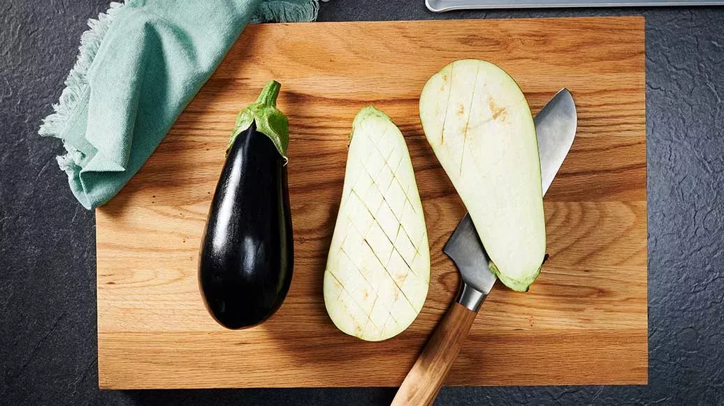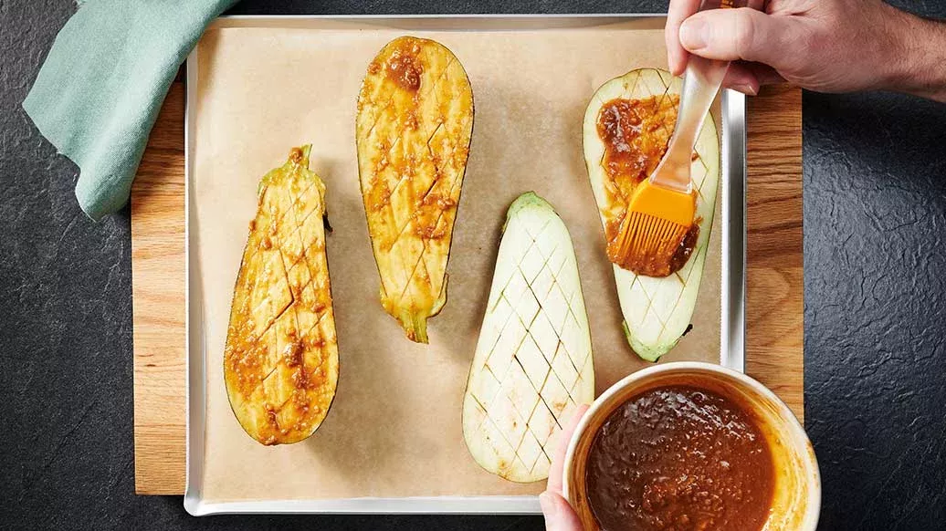 Värm ugnen till 180°C. Dela auberginerna i halvor på längden och skär köttet i ett diamantmönster, var noga med att inte skära igenom skalet. Klä en plåt med bakplåtspapper och lägg auberginerna ovanpå med de skurna sidorna uppåt.