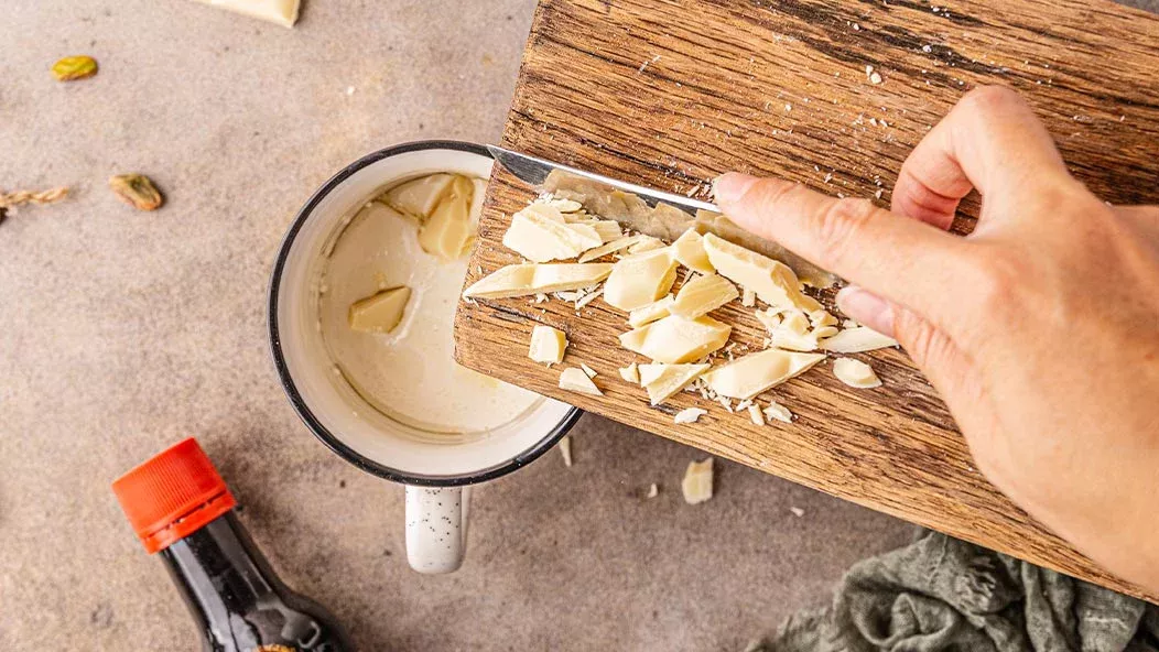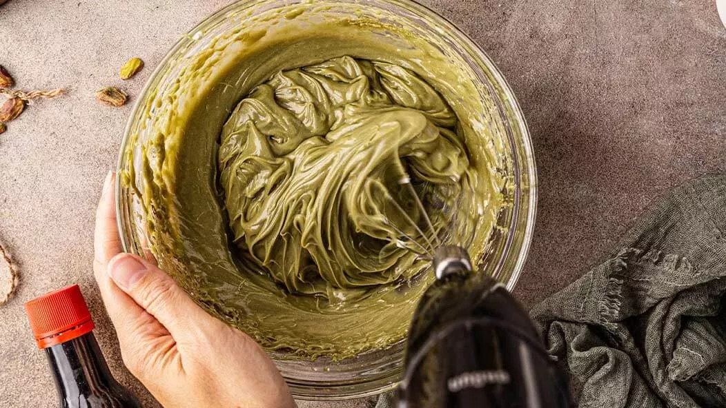I en mixerskål, lägg pistagekräm, mascarpone och den kylda chokladkrämen. Vispa tills du har en fluffig blandning.