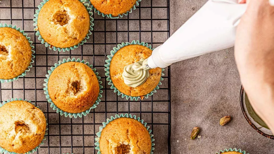 Dekorera muffinsen med pistagekrämen och strö över rostade pistagenötter.